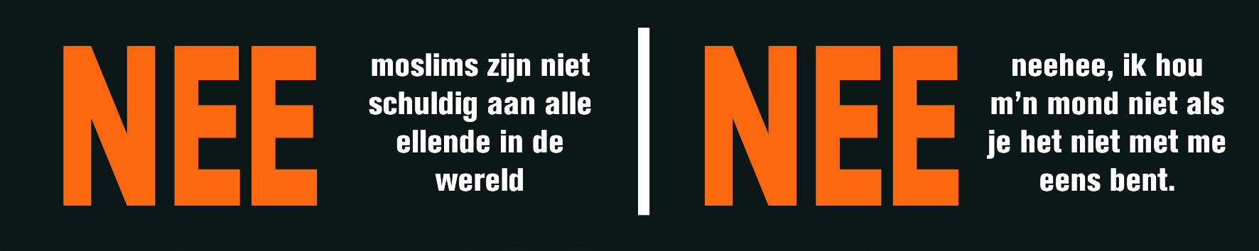 Sticker: nee, moslims zijn niet schuldig aan alle ellende in de wereld. Nee, ik houd m’n mond niet als je het niet met me eens bent