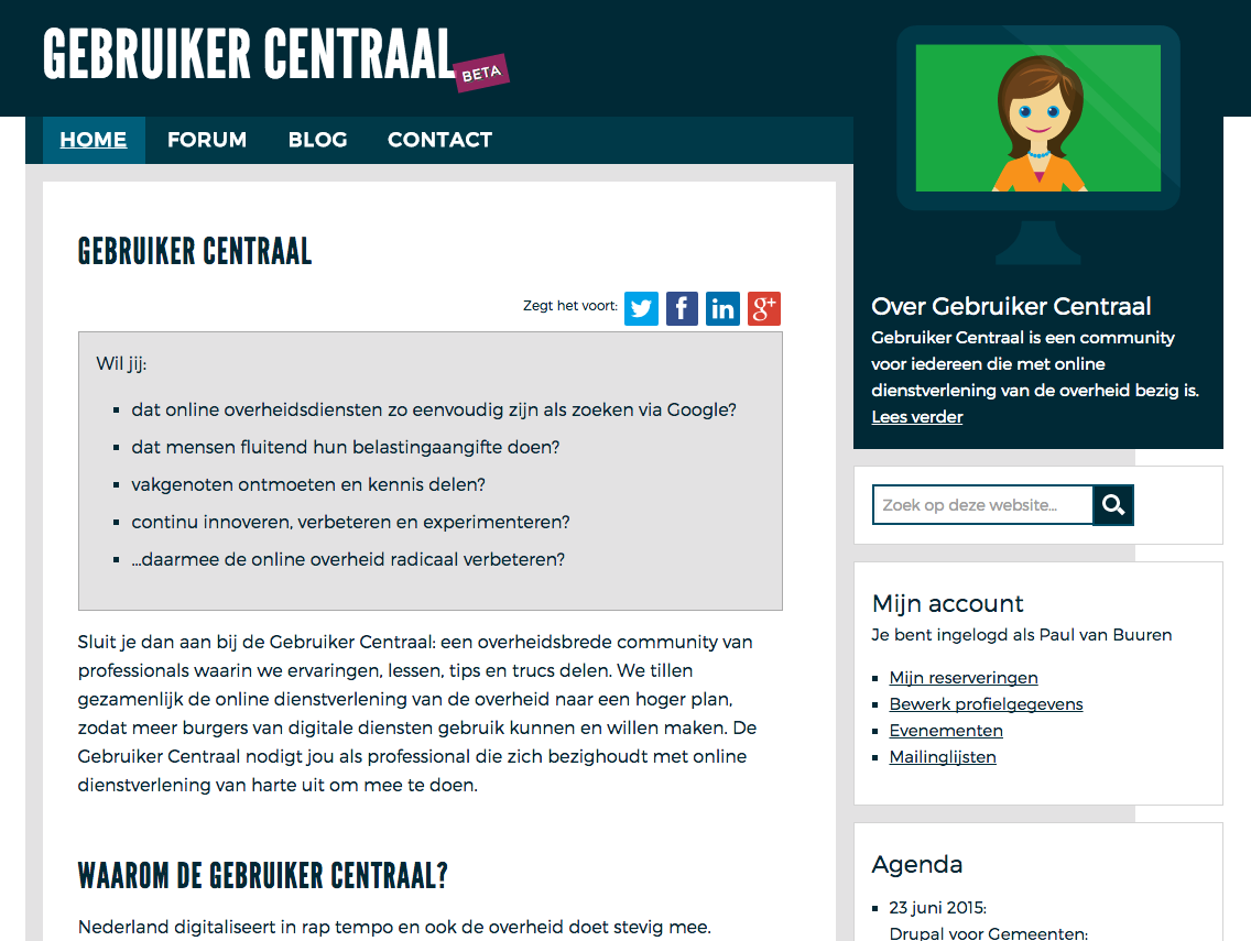 gebruiker-centraal-screenshotVoor ICTU maakte ik de website Gebruiker Centraal. Dit wordt het platform voor medewerkers van overheden (en andere belangstellenden) voor kennisdeling. Via de site kun je informatie vinden over best practices, tips en bijeenkomsten.