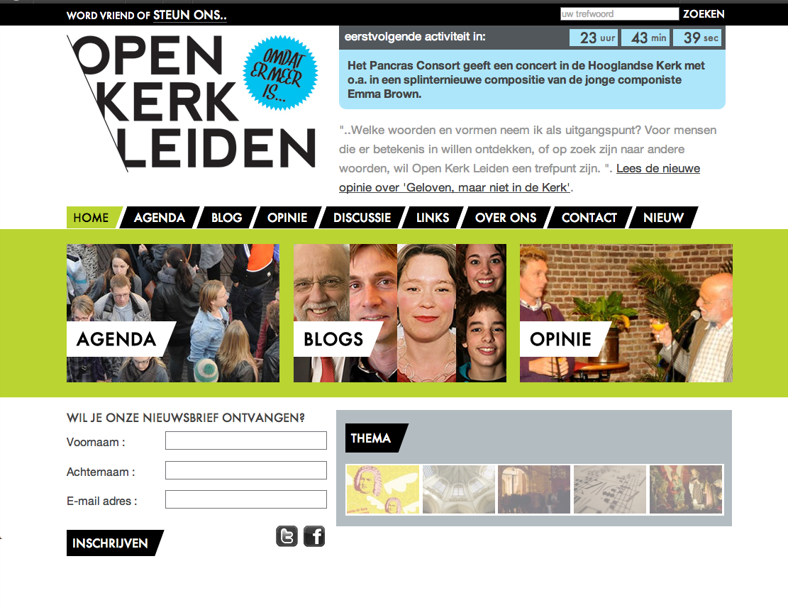 Openkerkleiden.nl is opgezet als ontmoetingsplaats voor mensen die geloven, maar zich niet aan een kerk verbonden voelen. De site heeft een duidelijk aanwezige agenda voor diverse activiteiten, zoals optredens en diensten. Op de site worden maatschappelijk relevante artikelen geplaatst en er is maatschappelijke discussie.